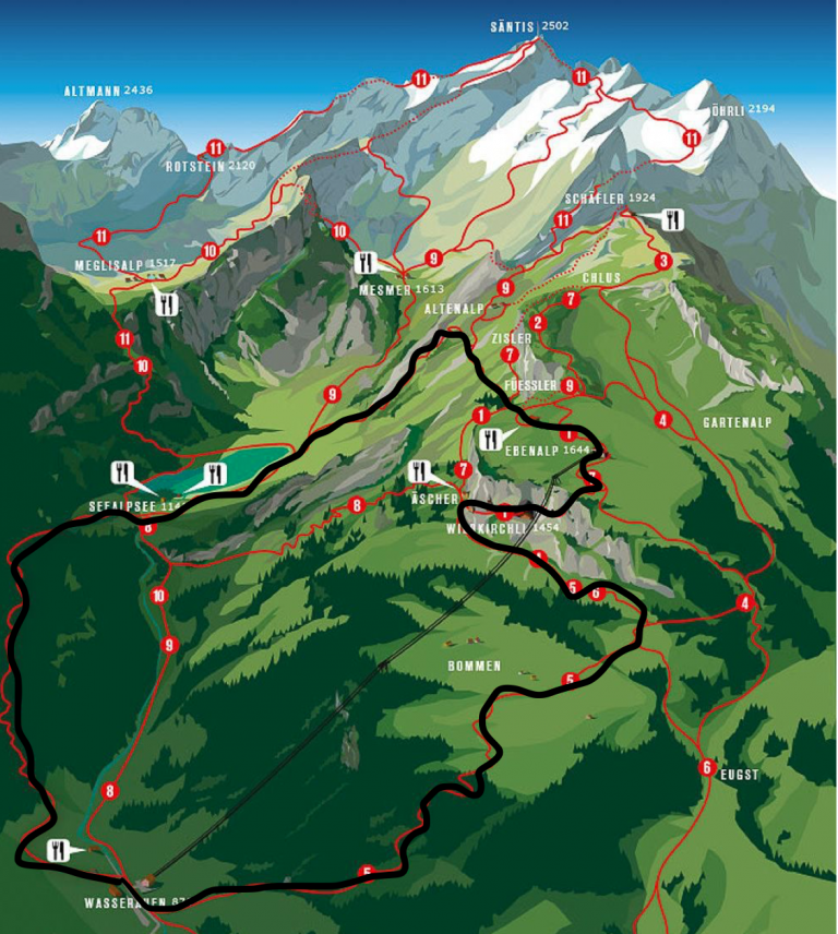Eenmaal aangekomen in Wasserauen, Appenzell, zijn er werkelijk talloze manieren waarop je de Seealpsee hike kunt doen. Wij kozen voor de route: Wasserauen – Bommen – Äscher – Ebenalp – Äscher – Seealpsee – Wasserauen. Kijk je op deze onderstaande kaart, dan hebben wij de zwarte route gelopen.